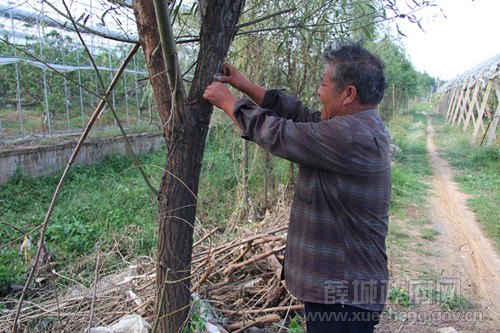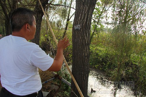 周氏啮小蜂是一种寄生美国白蛾老熟幼虫蛹的优势寄生蜂,一个柞蚕蛹中约含有5千头啮小蜂,且具有施放方便、省时省力、不污染环境、保护生态平衡的优点。图为技术人员将装有周氏啮小蜂寄生的柞蚕蛹的纸杯用图钉钉在树上。