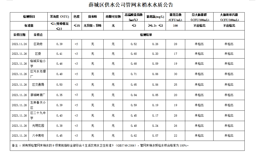 薛城区供水公司管网末梢水水质公告(2023年11月)