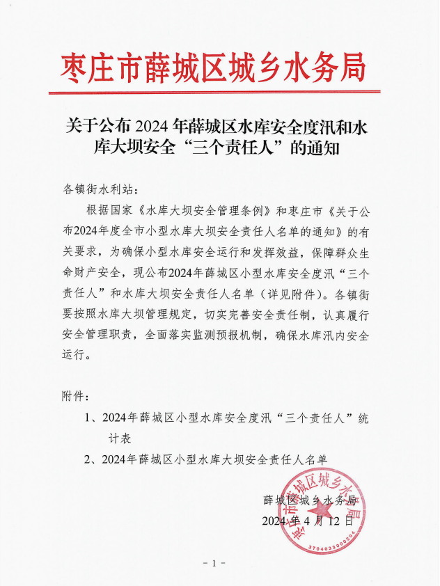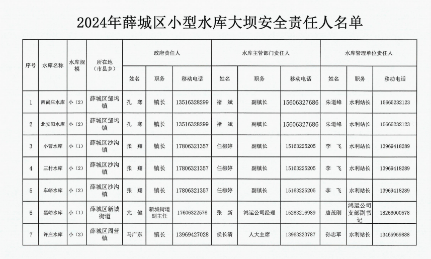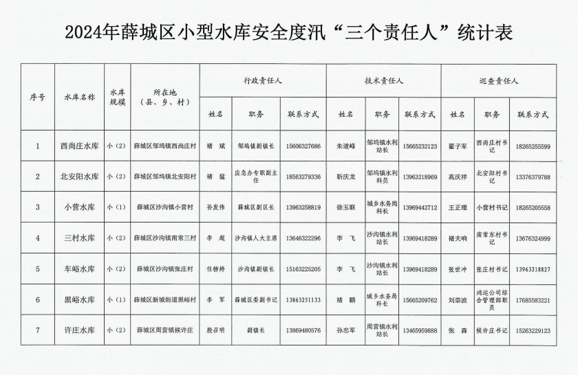 关于公布2024年薛城区水库安全度汛和水库大坝安全“三个责任人”的通知