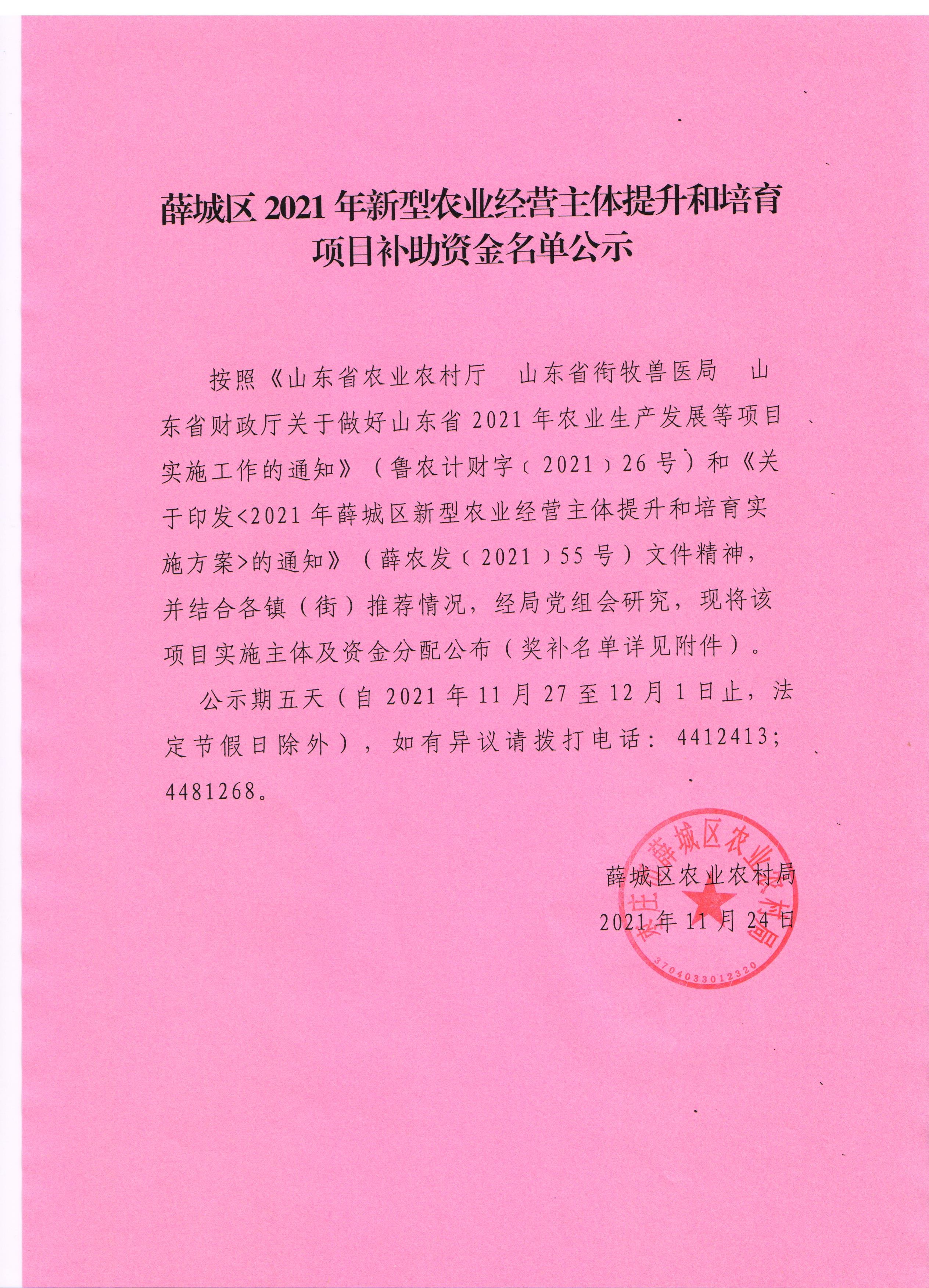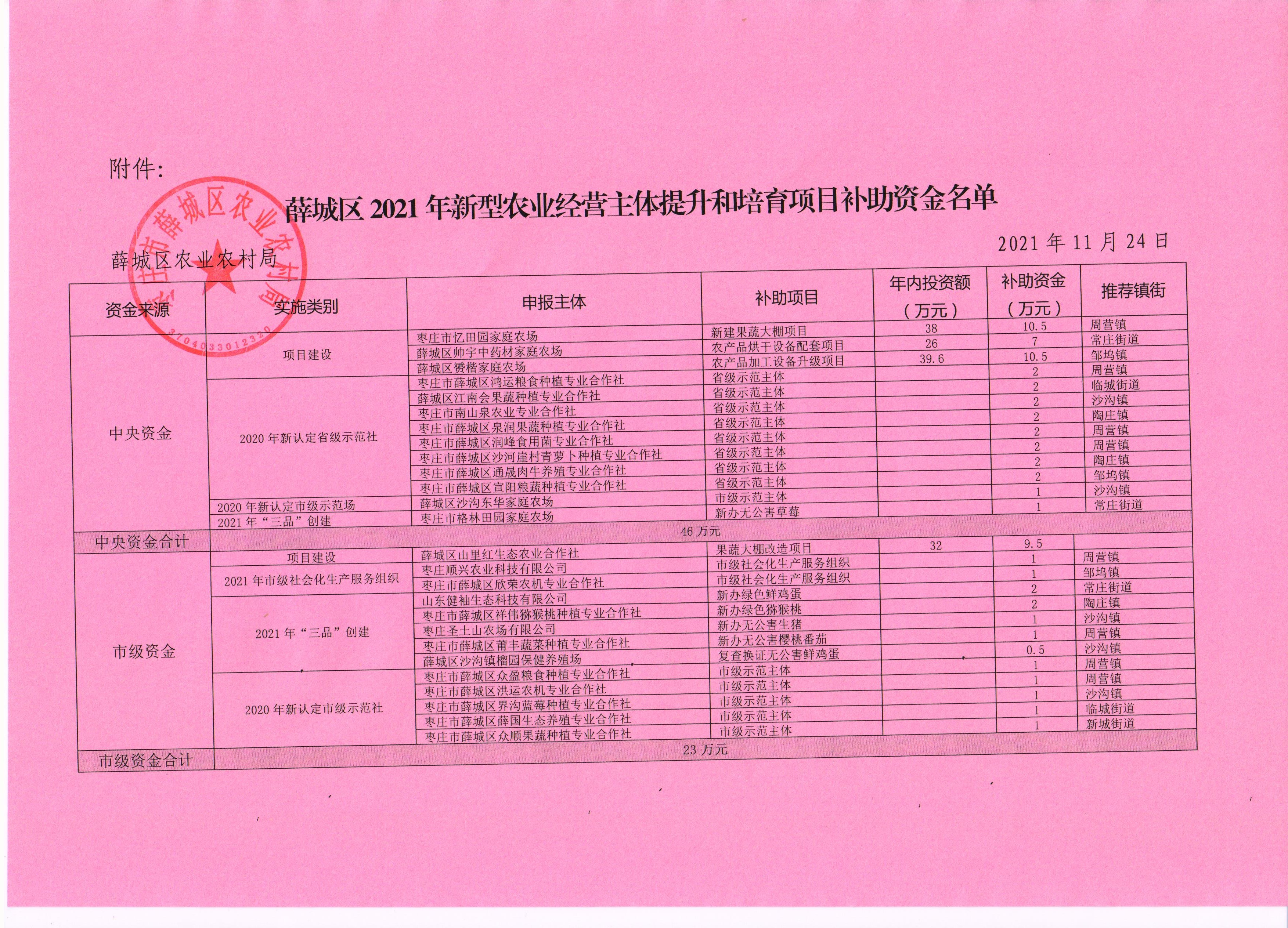 薛城区2021年新型农业经营主体提升和培育项目补助资金名单公示