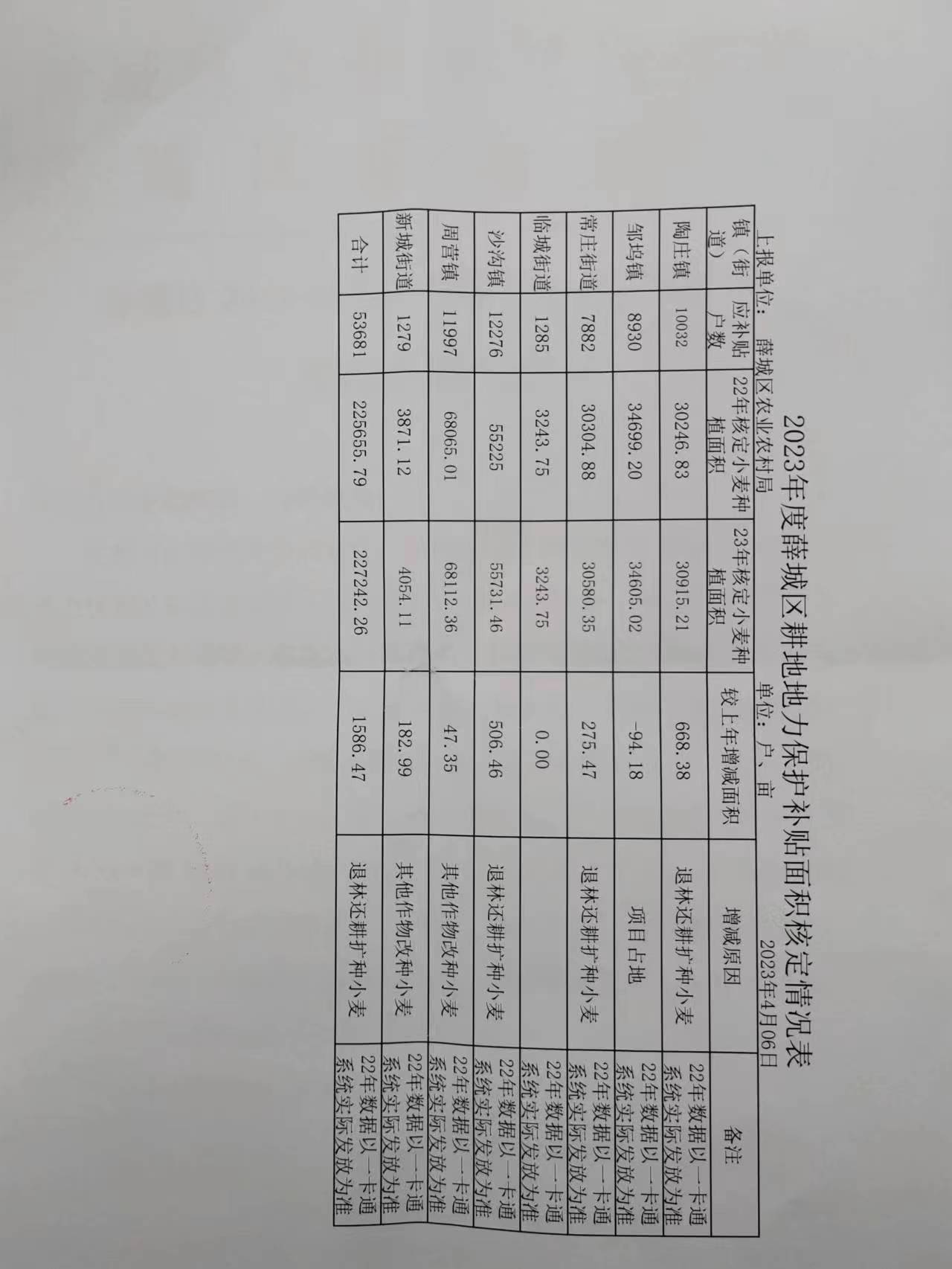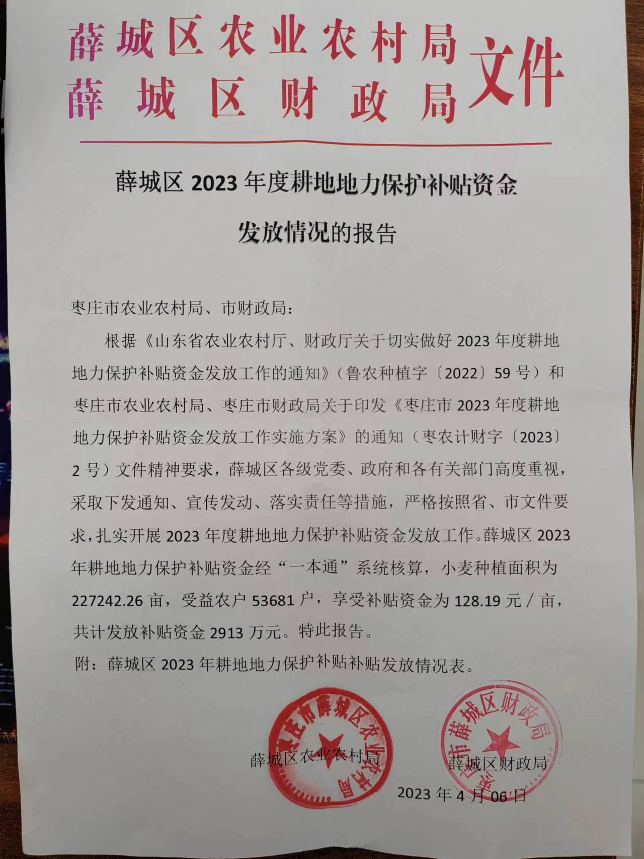 薛城区2023年度耕地地力保护补贴资金发放情况的报告