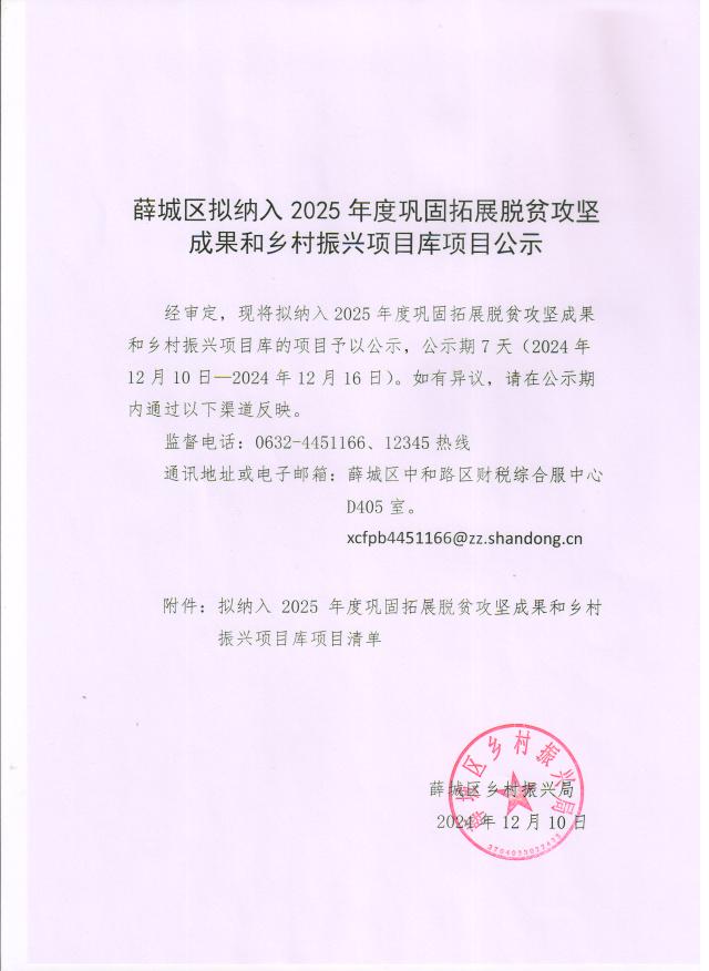 薛城区拟纳入2025年度巩固拓展脱贫攻坚成果和乡村振兴项目库项目公示