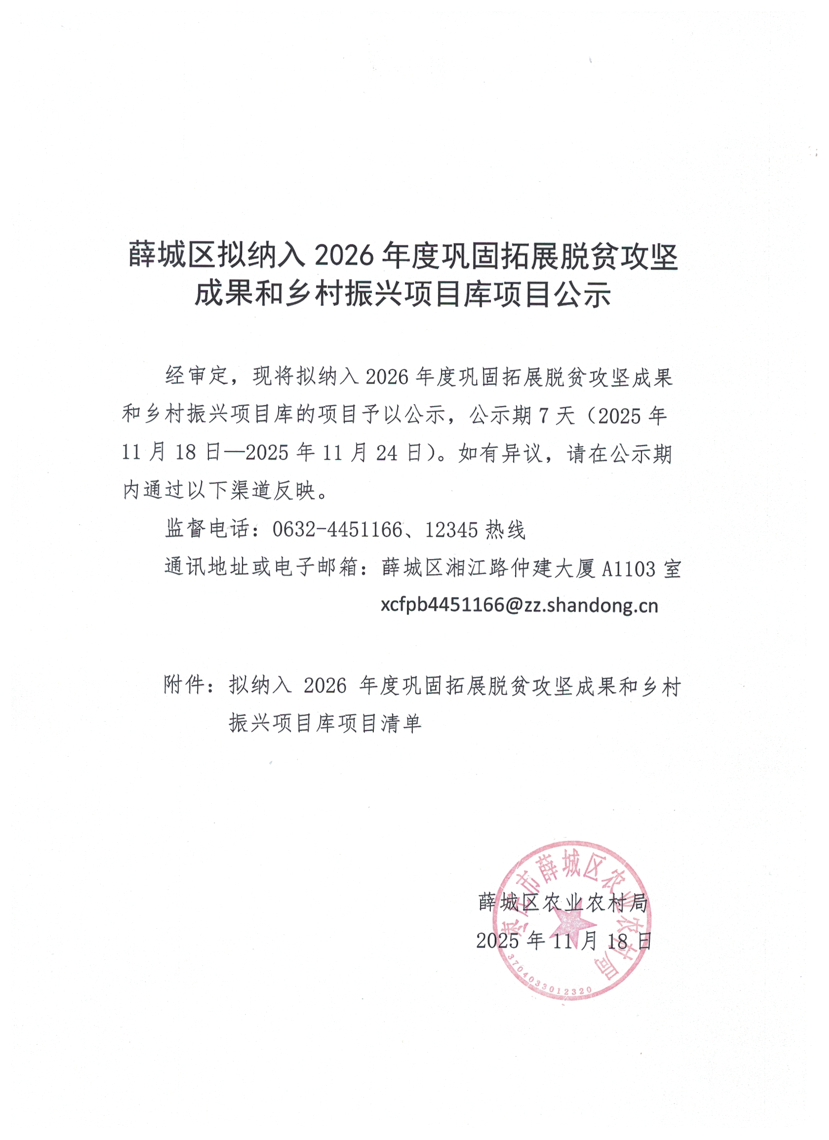• 标  题:薛城区拟纳入2026年度巩固拓展脱贫攻坚成果和乡村振兴项目库项目公示