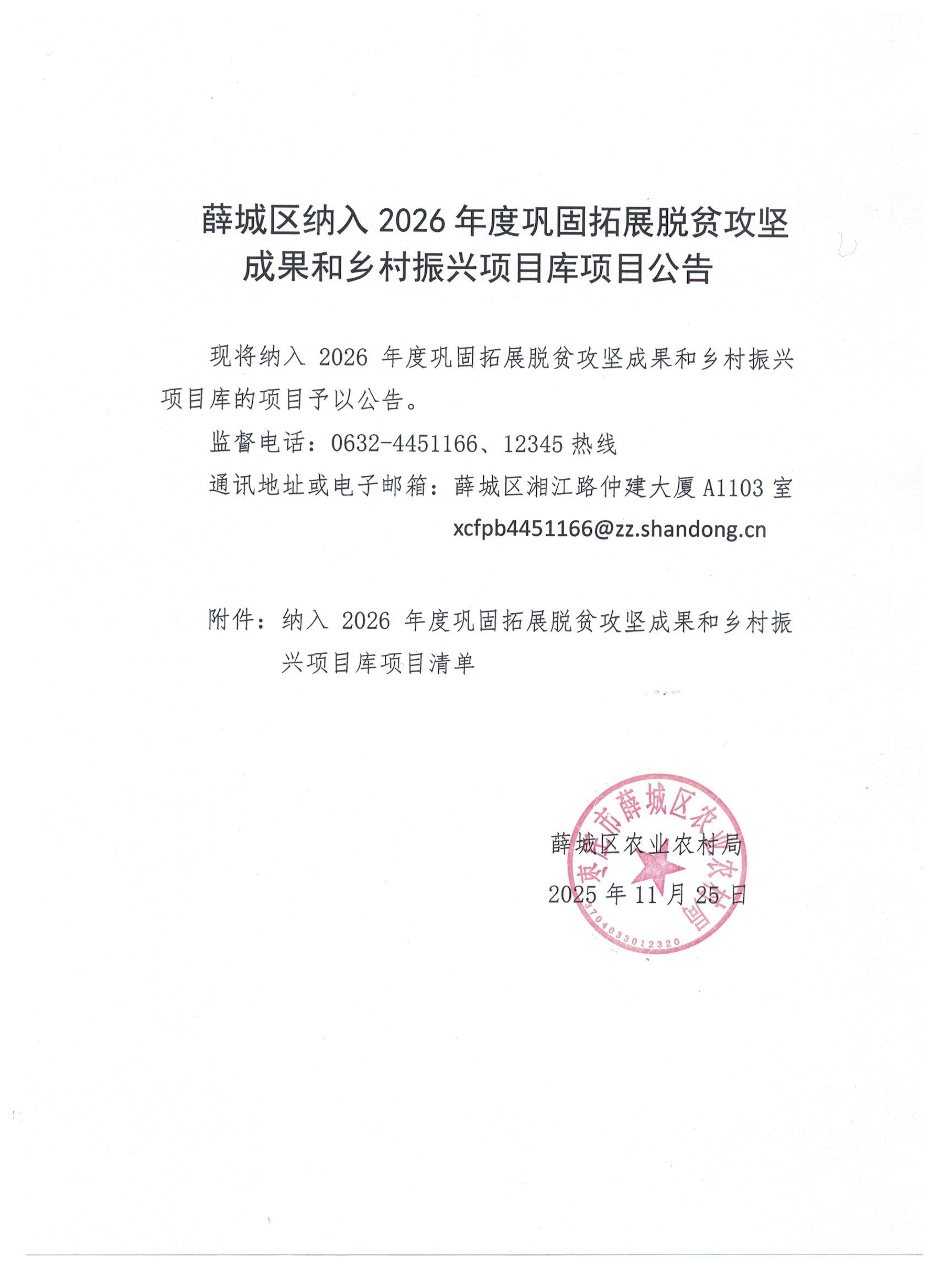 薛城区纳入2026年度巩固拓展脱贫攻坚成果和乡村振兴项目库项目公告