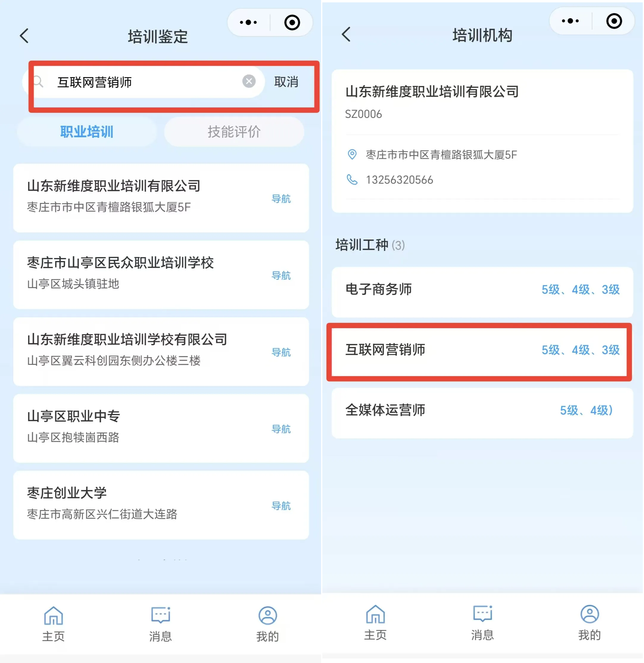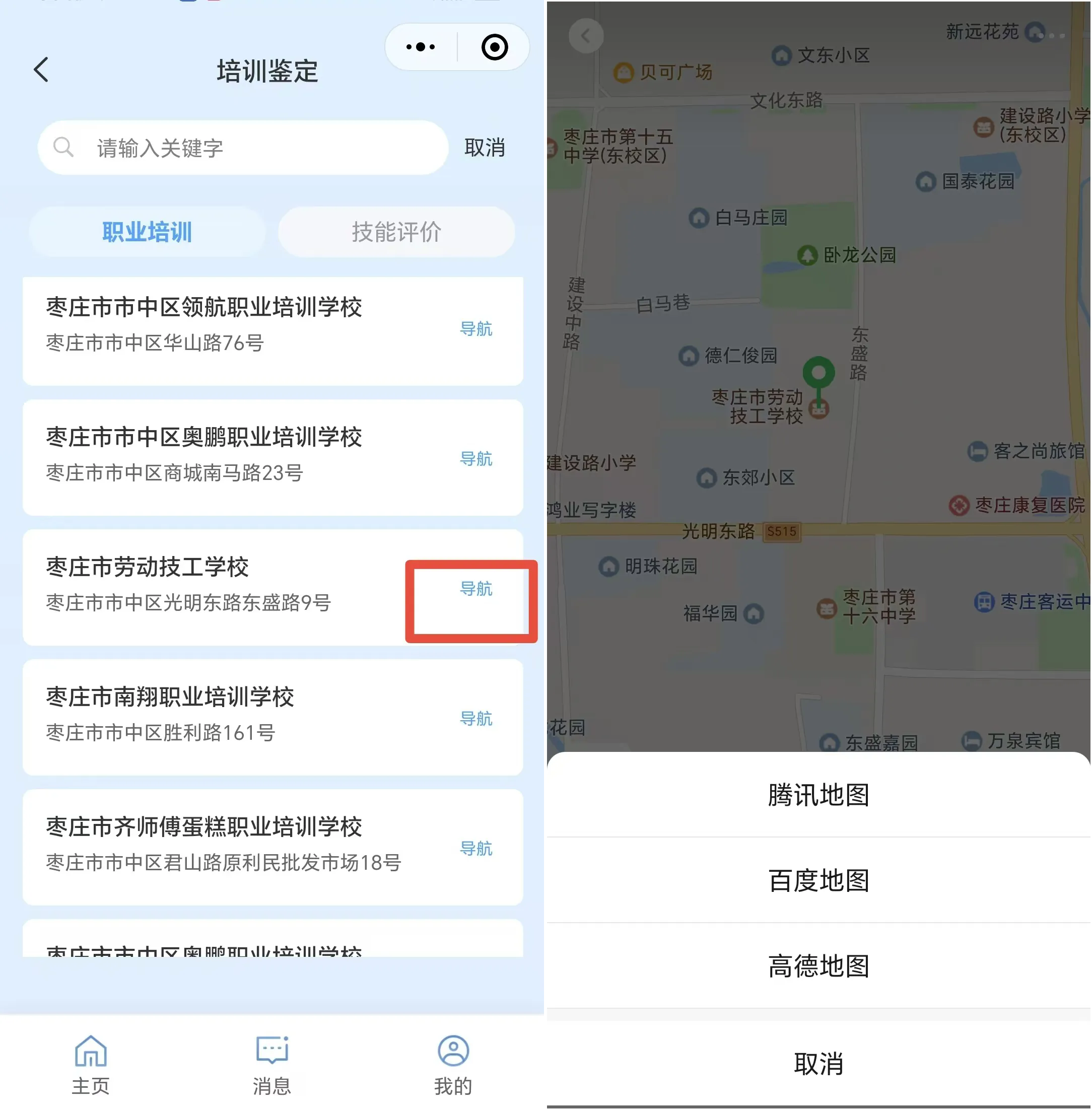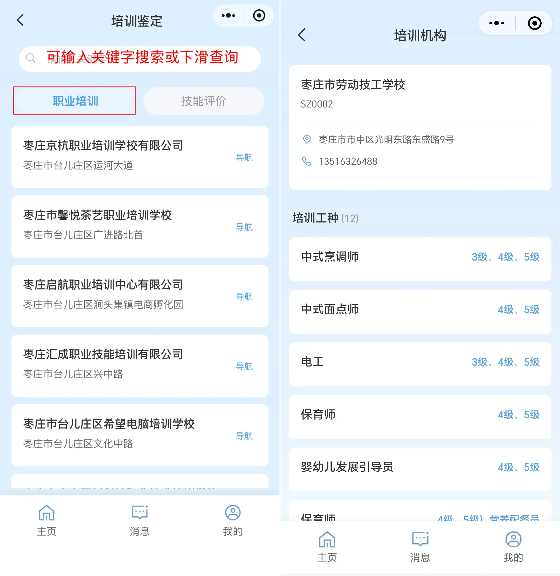 广大劳动者可通过微信打开“枣工快递”小程序主页,下滑至底端选择“培训鉴定”,点击“职业培训”按钮,即可查看各培训机构相关信息,或点击“位置”标识一键导航直达。地图支持搜索查询功能,劳动者可按职业(工种)名称或机构名称进行搜索,支持模糊查询。具体见下图: