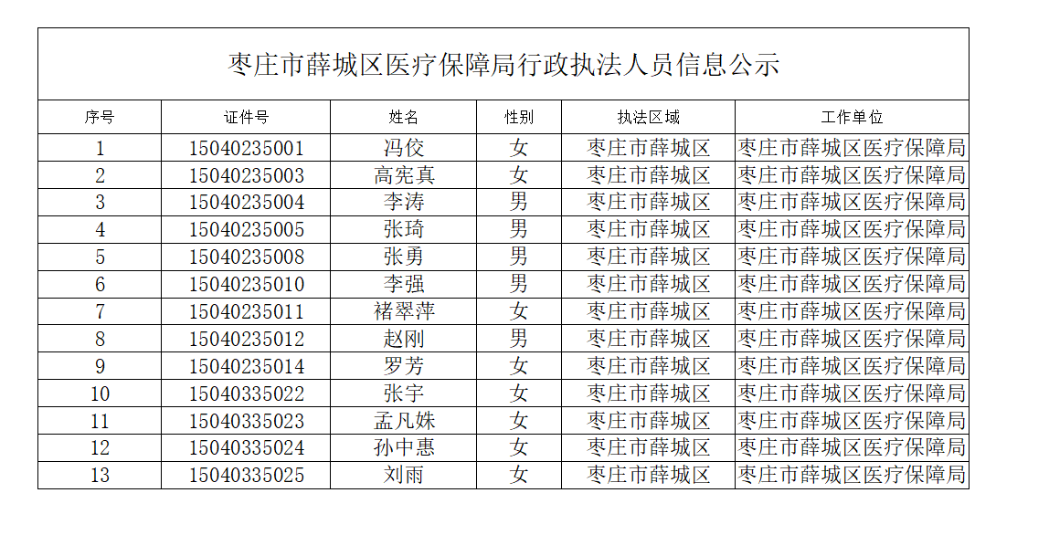 枣庄市薛城区医疗保障局行政执法人员信息公示