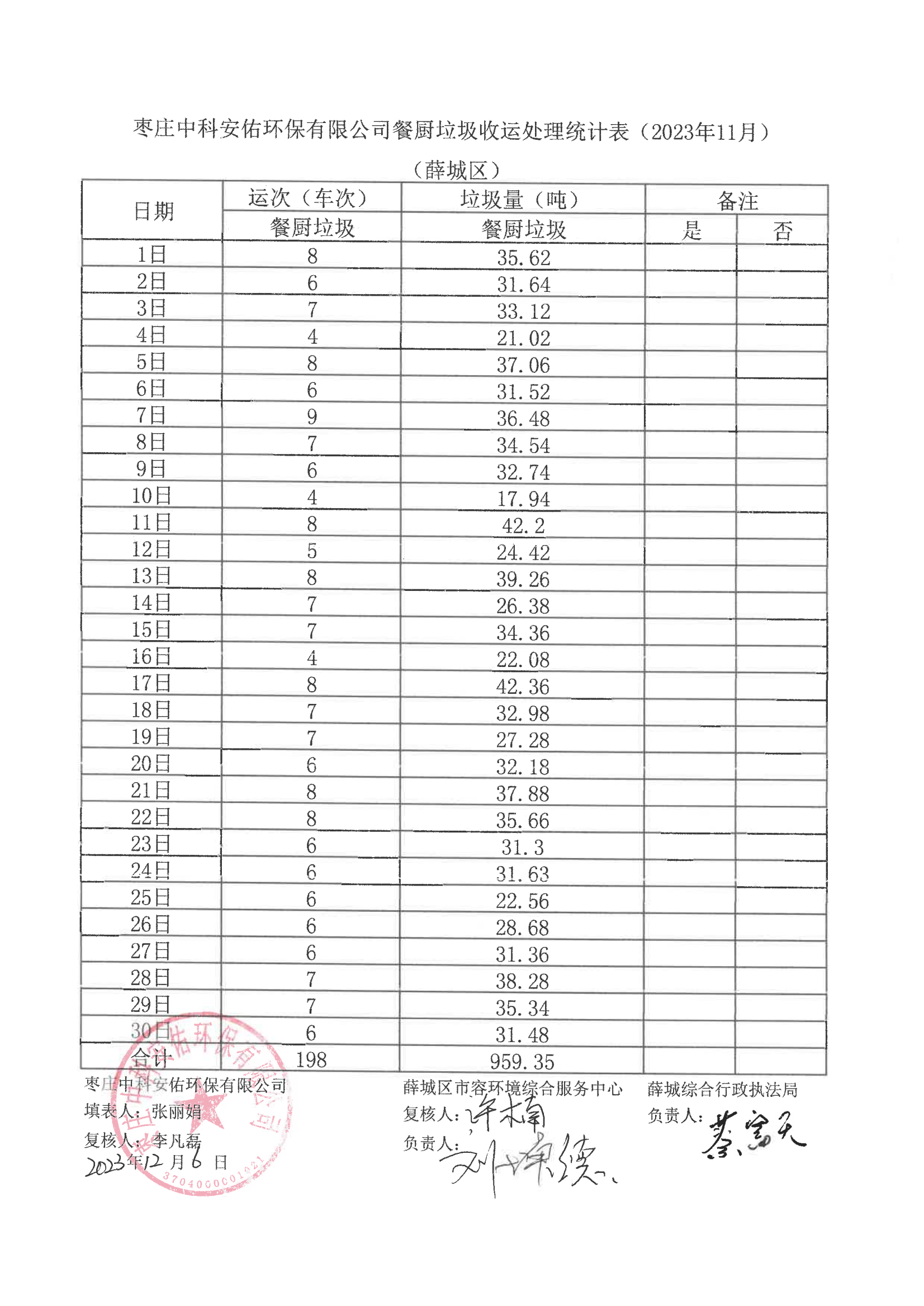 枣庄中科安佑环保有限公司餐厨垃圾收运处理统计表