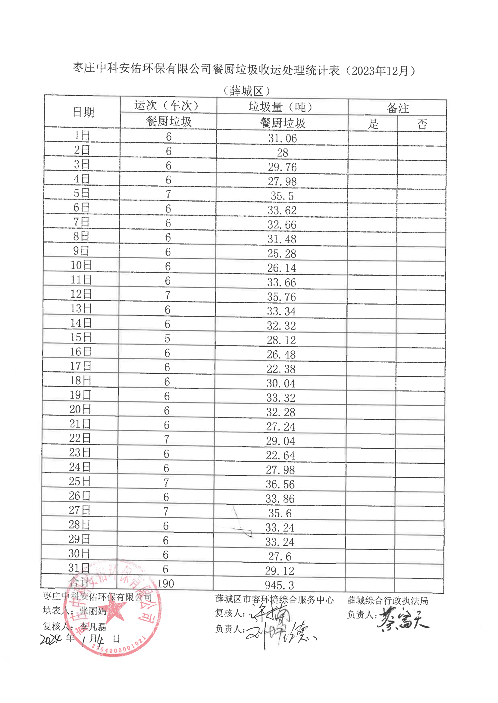 枣庄中科安佑环保有限公司餐厨垃圾收运处理统计表