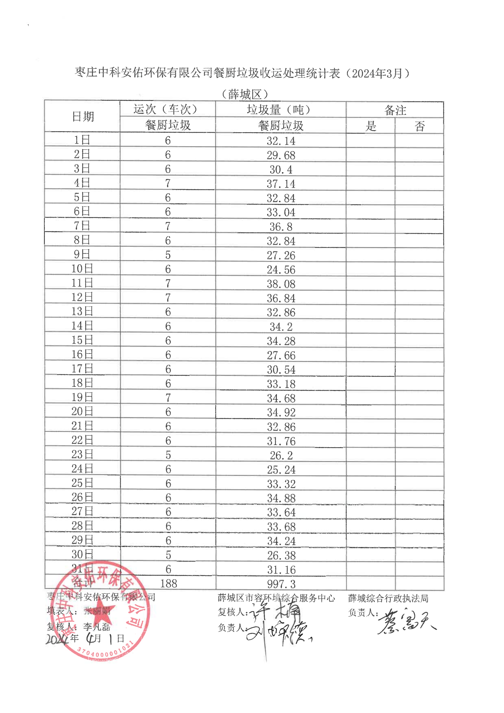 枣庄中科安佑环保有限公司餐厨垃圾收运处理统计表