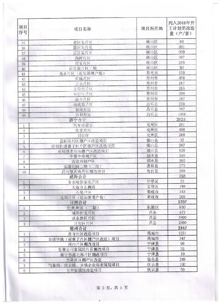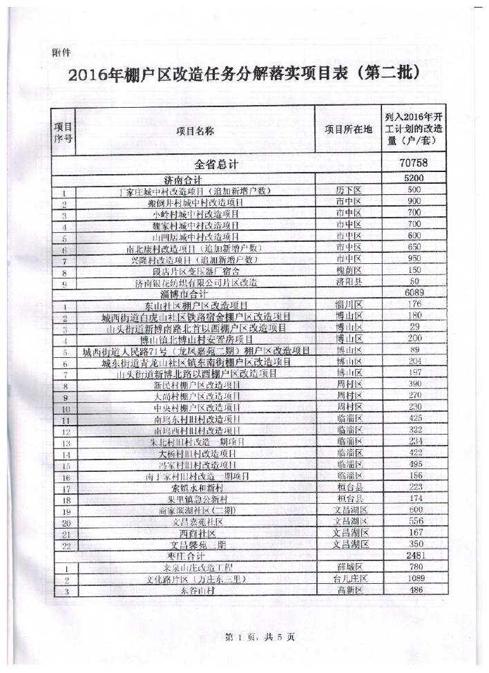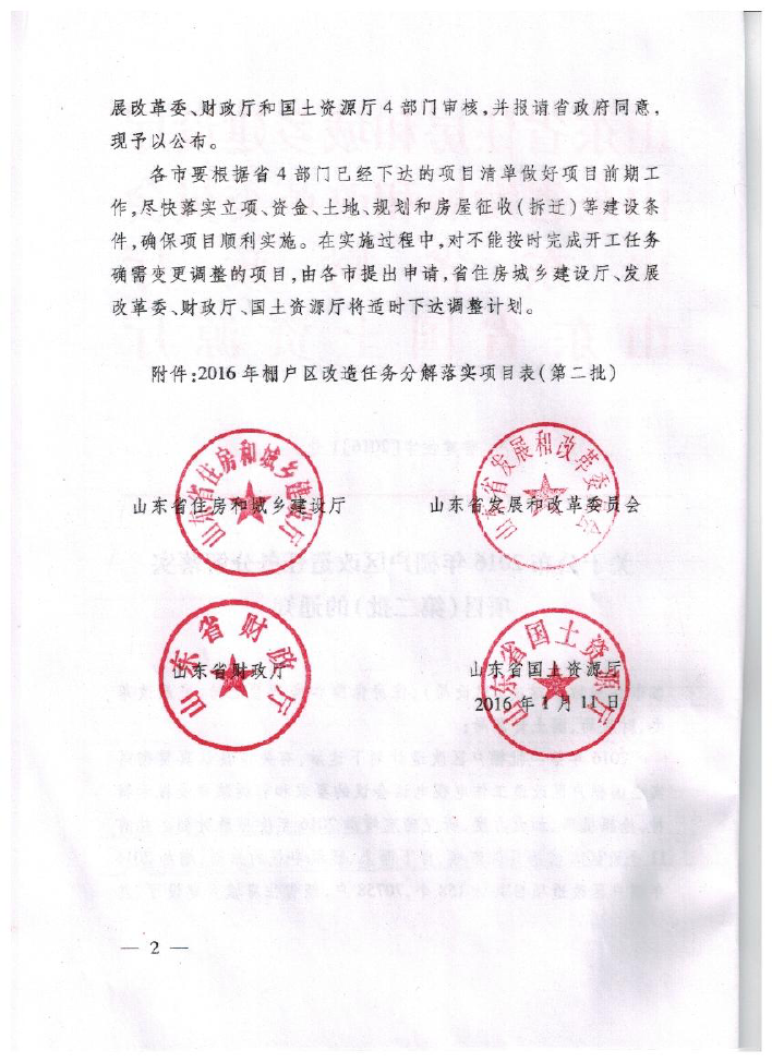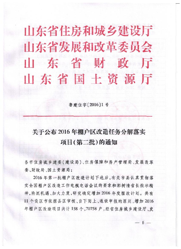• 标  题:鲁建住字【2016】1号 关于公布2016年棚户区改造任务分解落实项目第二批的通知