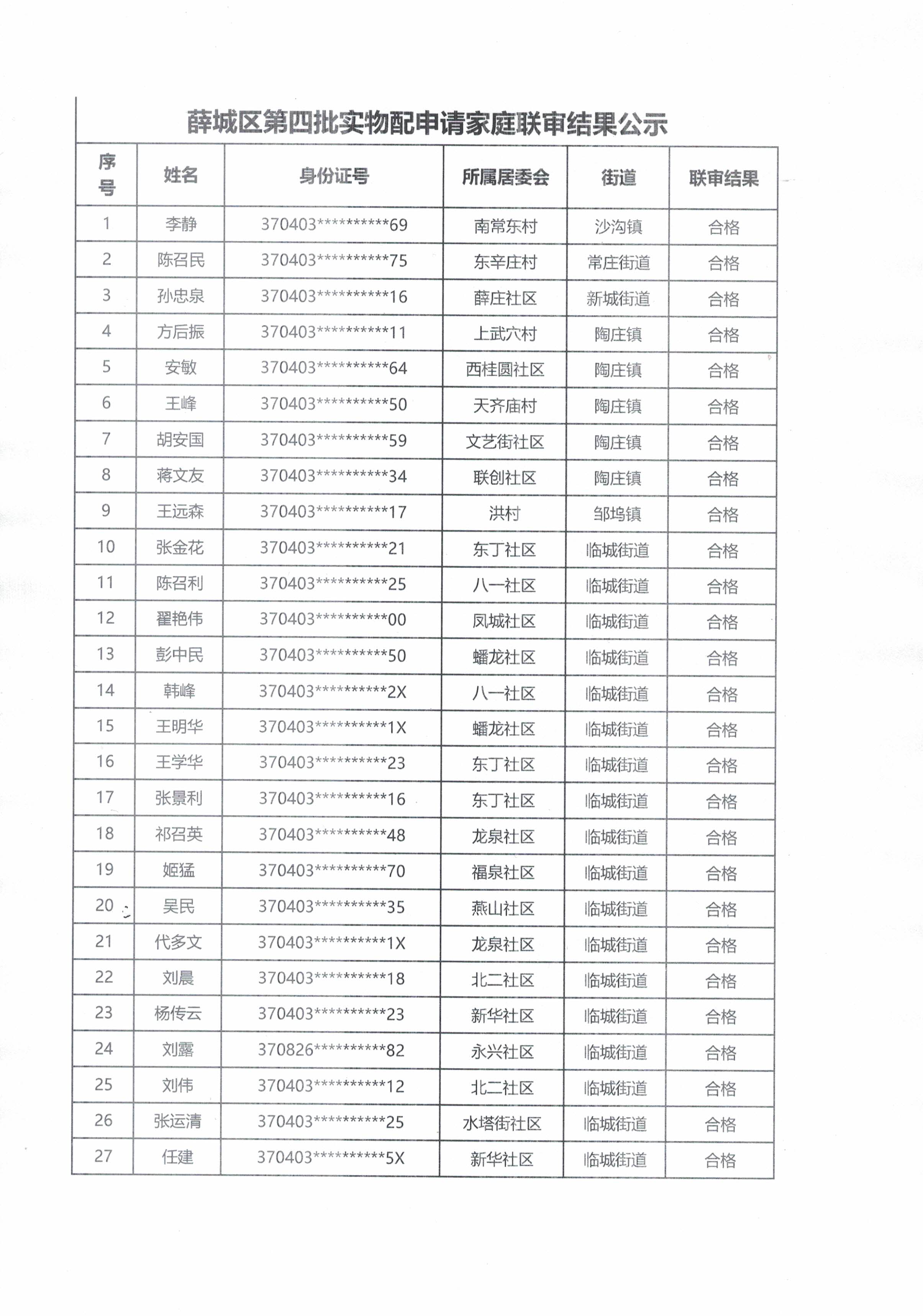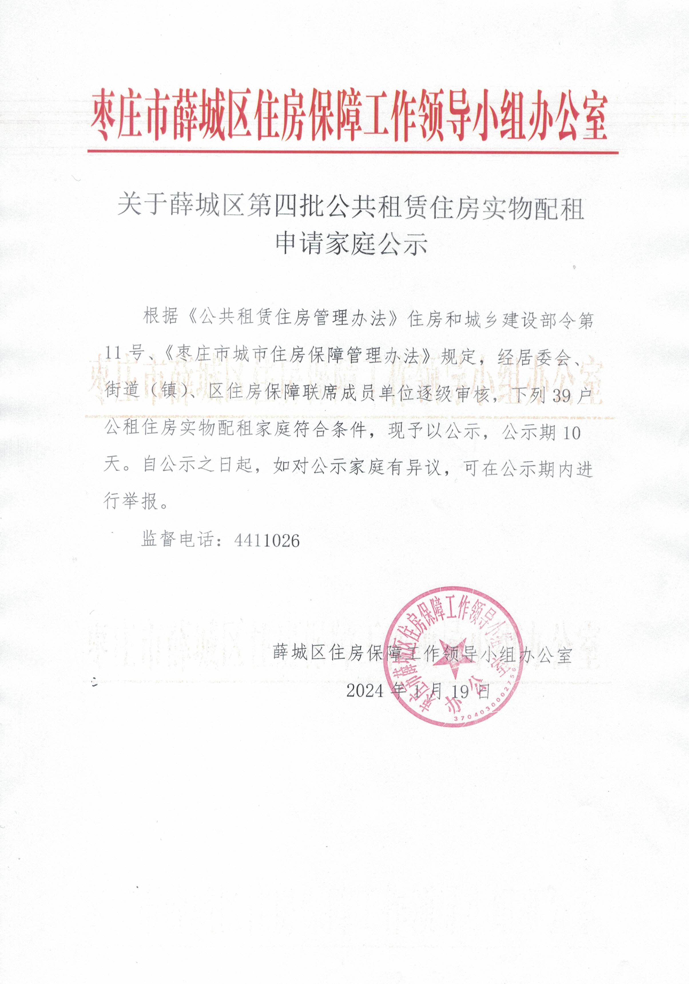 关于薛城区第四批公共租赁住房实物配租申请家庭公示