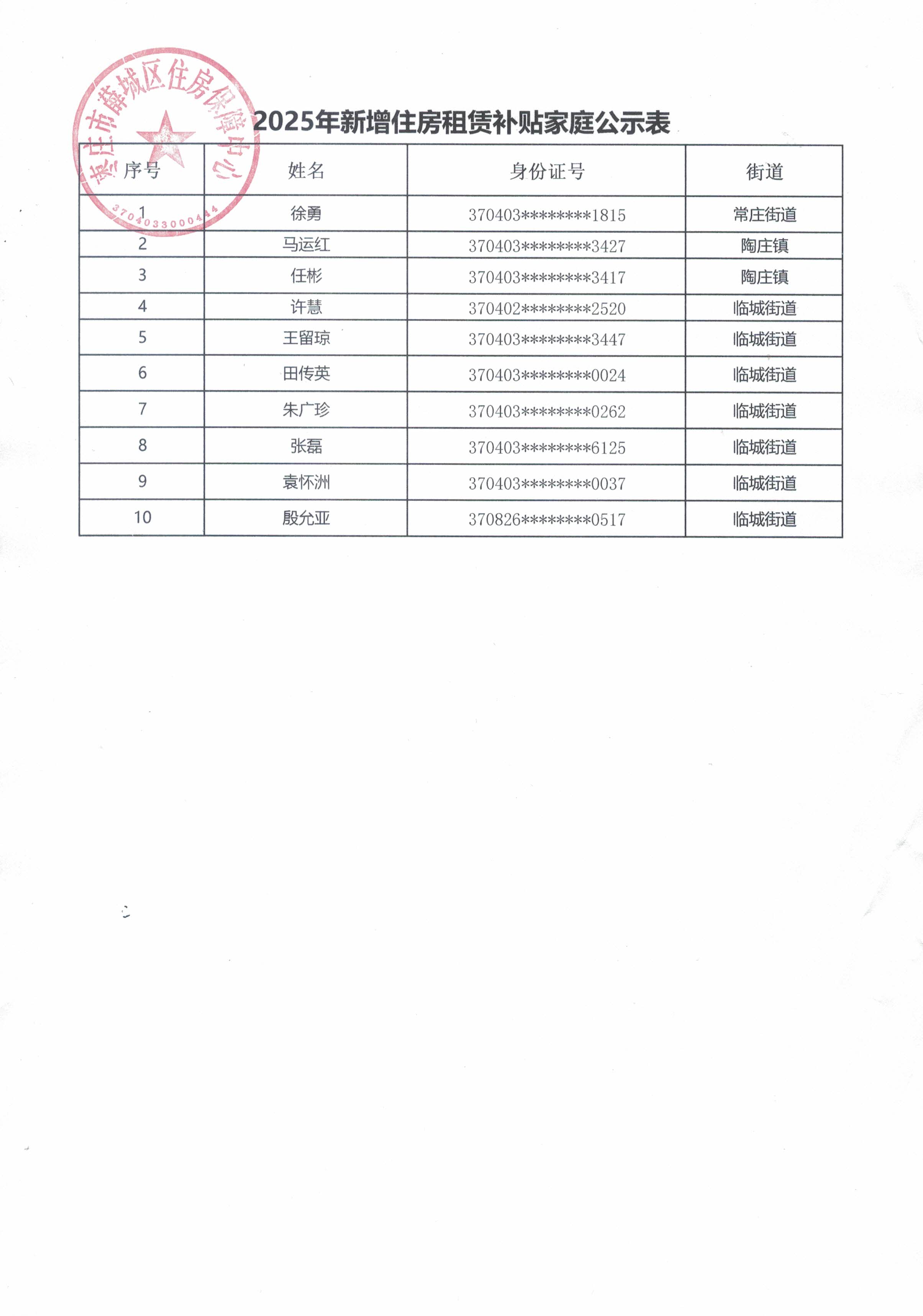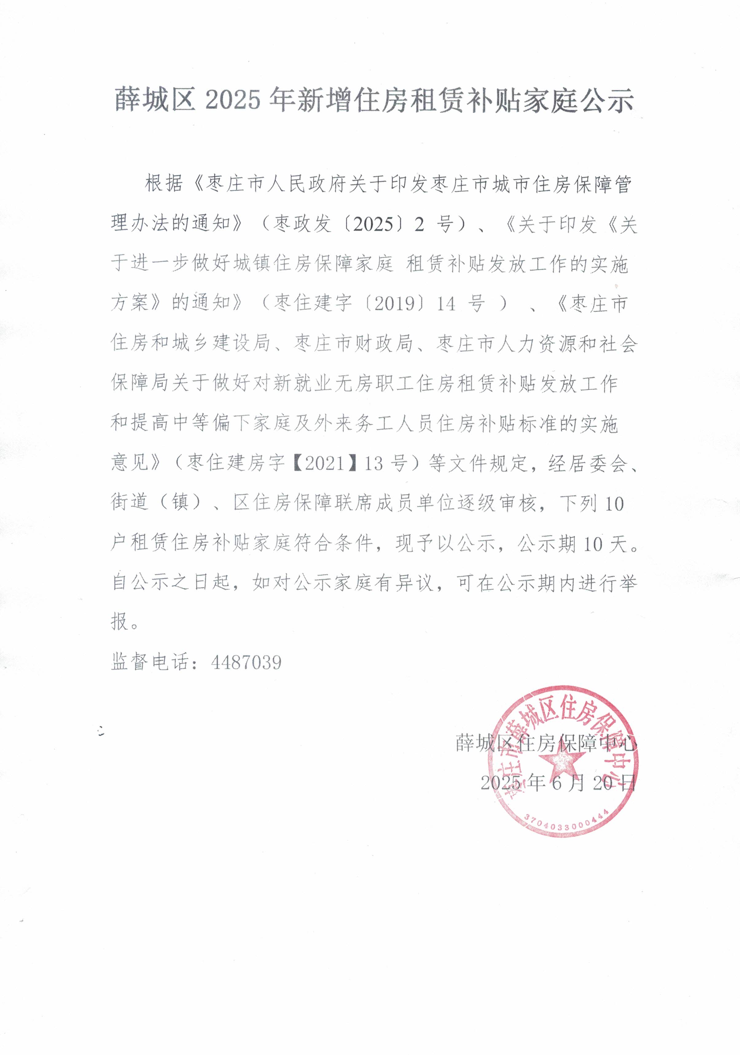 • 标  题:薛城区2025年新增住房租赁补贴家庭公示