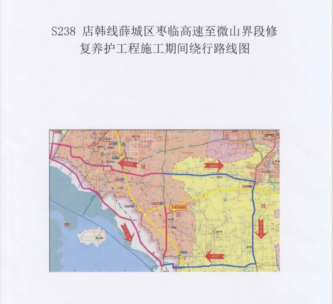因G518日定线薛城区北二村至微山界段、S238店韩线薛城区枣临高速至微山界段2个路段修复养护工程路面改造施工,为确保交通安全和施工顺利进行,根据《中华人民共和国道路交通安全法》、《中华人民共和国公路法》等有关法律规定,施工期间G518日定线薛城区北二村至微山界段实行半幅路面封闭施工,另半幅路面双向通行;S238店韩线薛城区枣临高速至微山界段实行分段全幅封闭,分段施工。