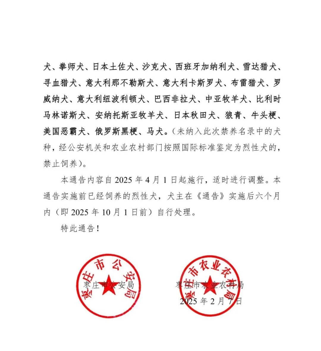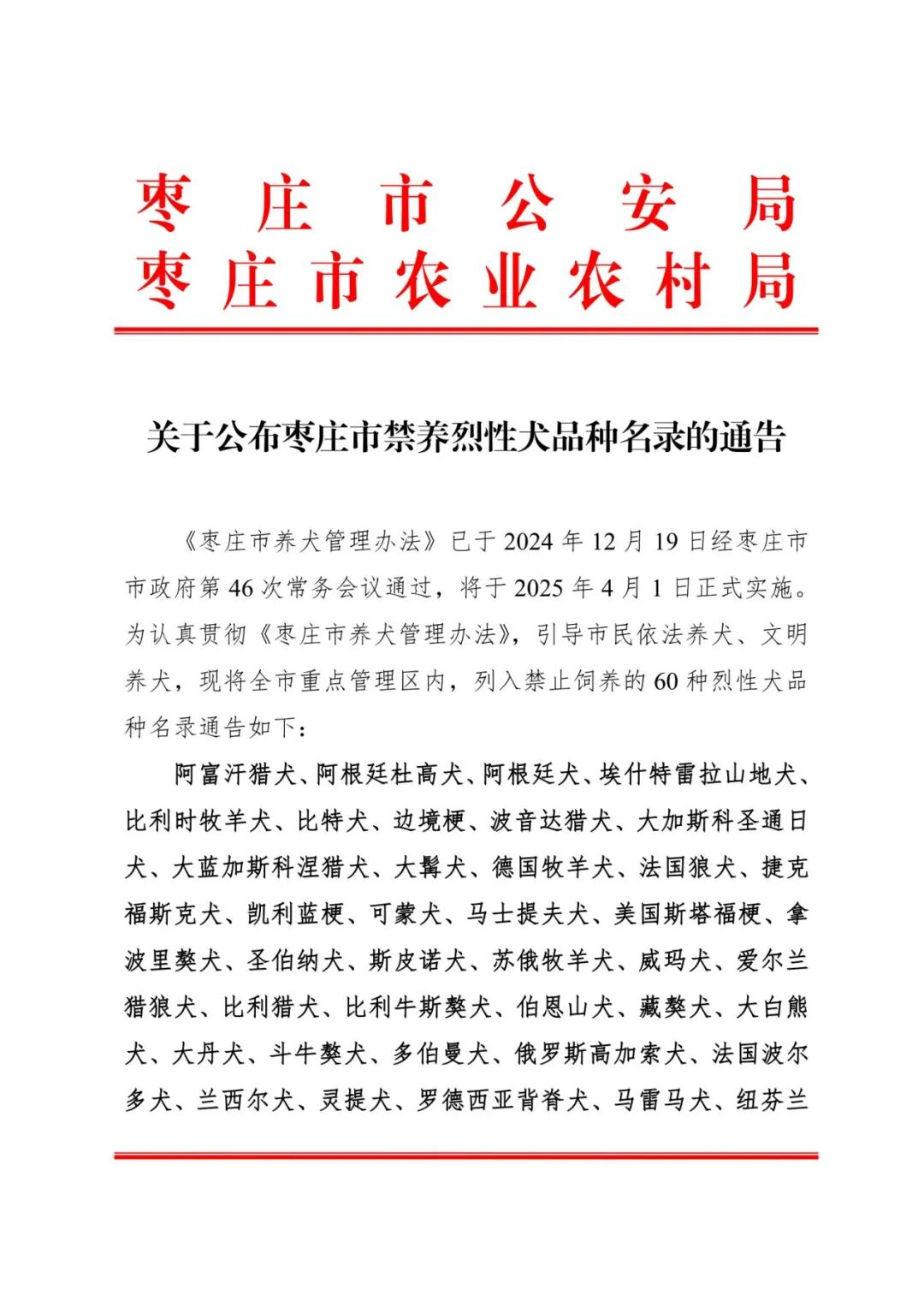 2.枣庄市公安局、枣庄市农业农村局《关于公布枣庄市禁养烈性犬品种名录的通告》