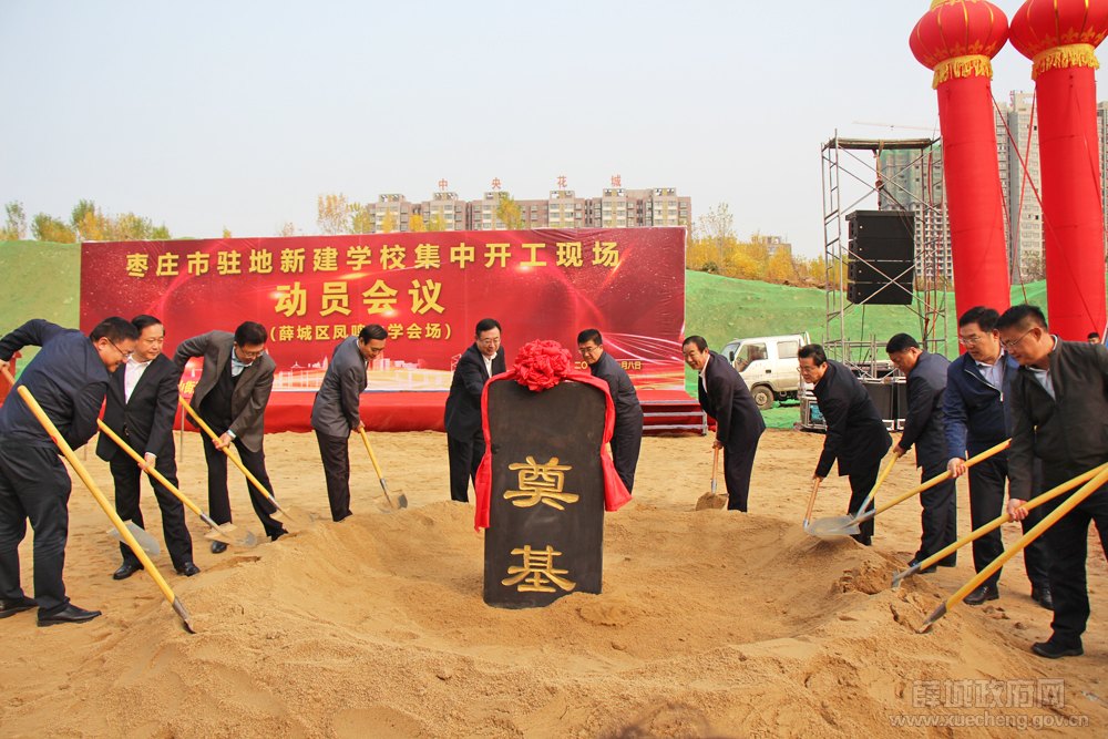 会议现场,石爱作宣布项目开工;市教育局、薛城区、枣庄高新区主要负责人分别作发言;与会领导共同为项目开工培土奠基。