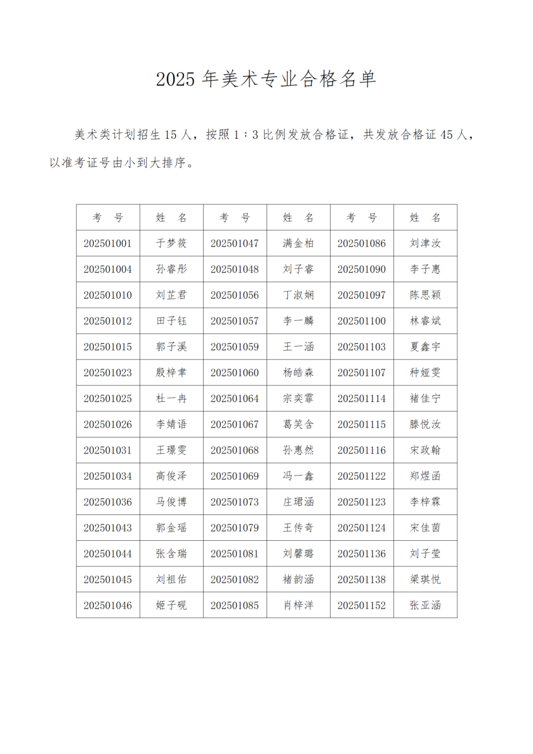 依据《枣庄市2025年初中学业水平考试暨高中段学校招生工作方案》(枣教发〔2025]3号)、《薛城区2025年初中学业水平考试暨高中段学校招生工作方案》(薛教体发〔2025〕7号)和《枣庄市第五中学(高中部)2025年艺体专业生招生简章》的文件要求,我校已完成艺术专业生的专业测试和预录工作,经学校研究决定,按照规定的比例发放合格证,现公示如下。