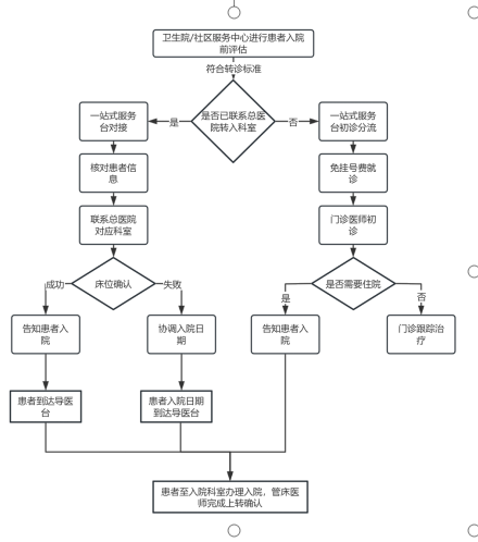 1、指定双向转诊服务部门,制定具体双向转诊接诊流程,指定专人负责双向转诊工作,设立专线电话,实行24小时连续服务,建立双向转诊绿色通道,确保服务质量;